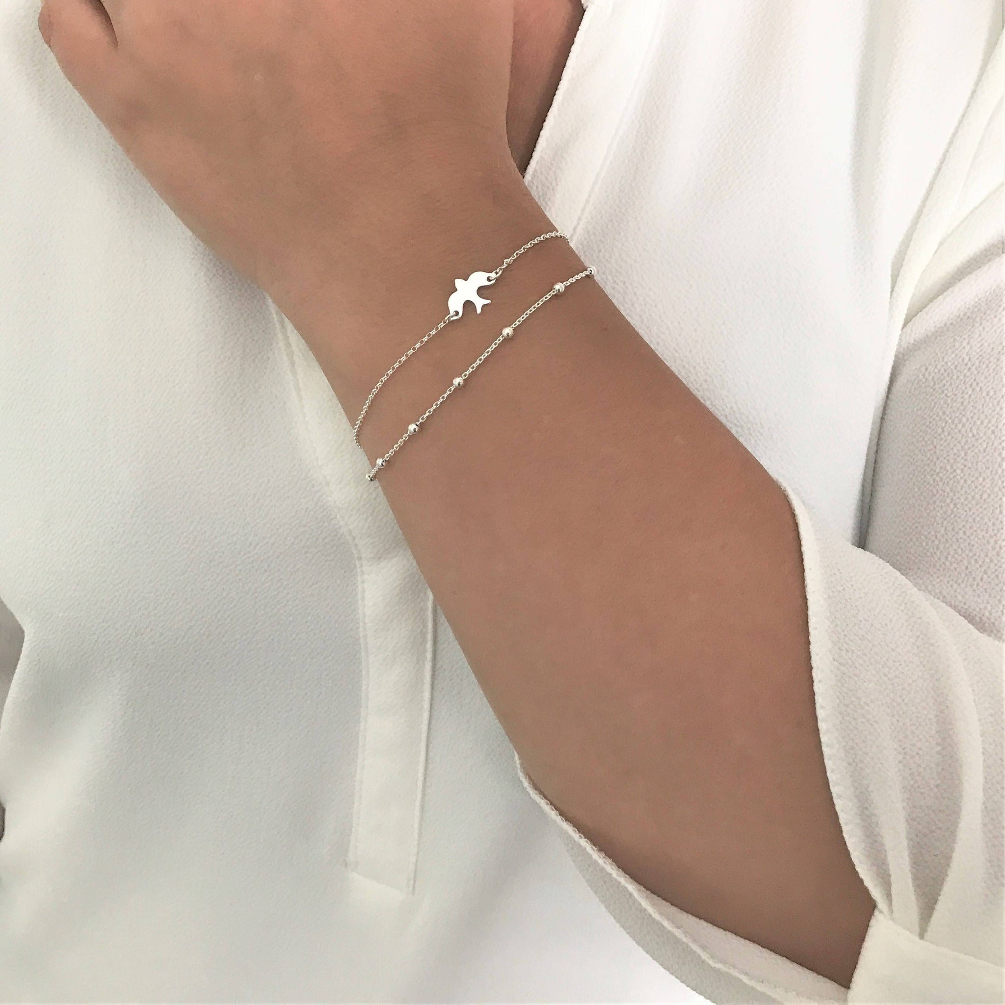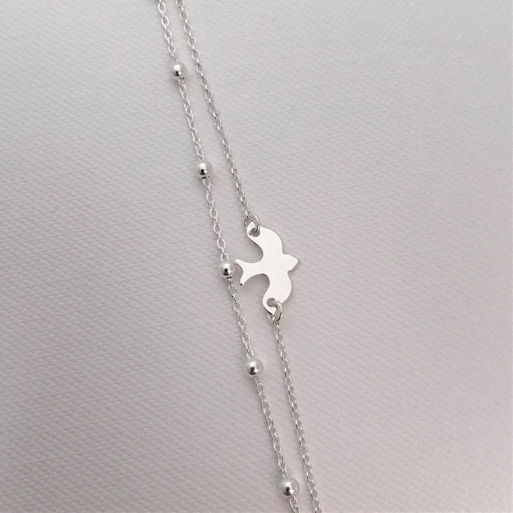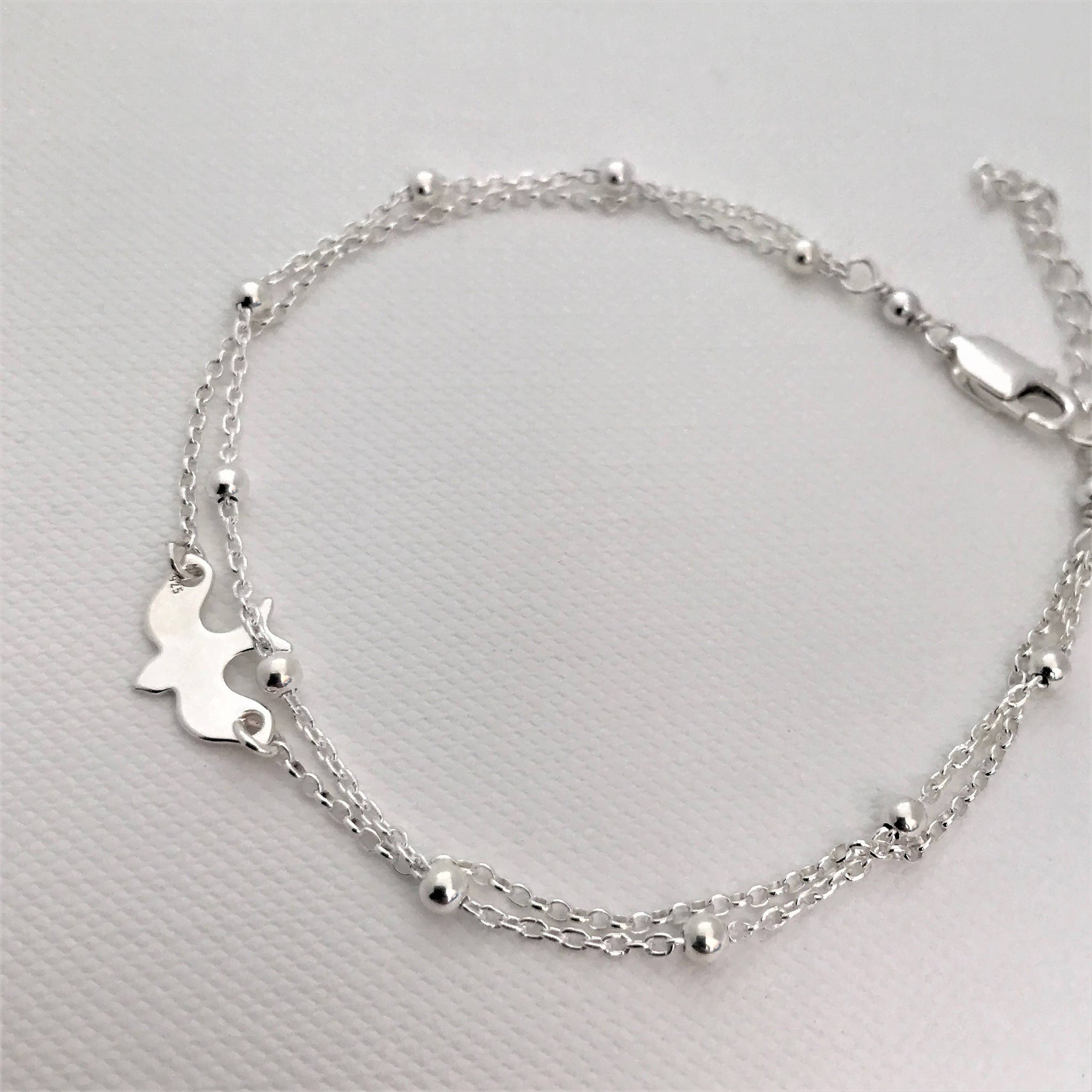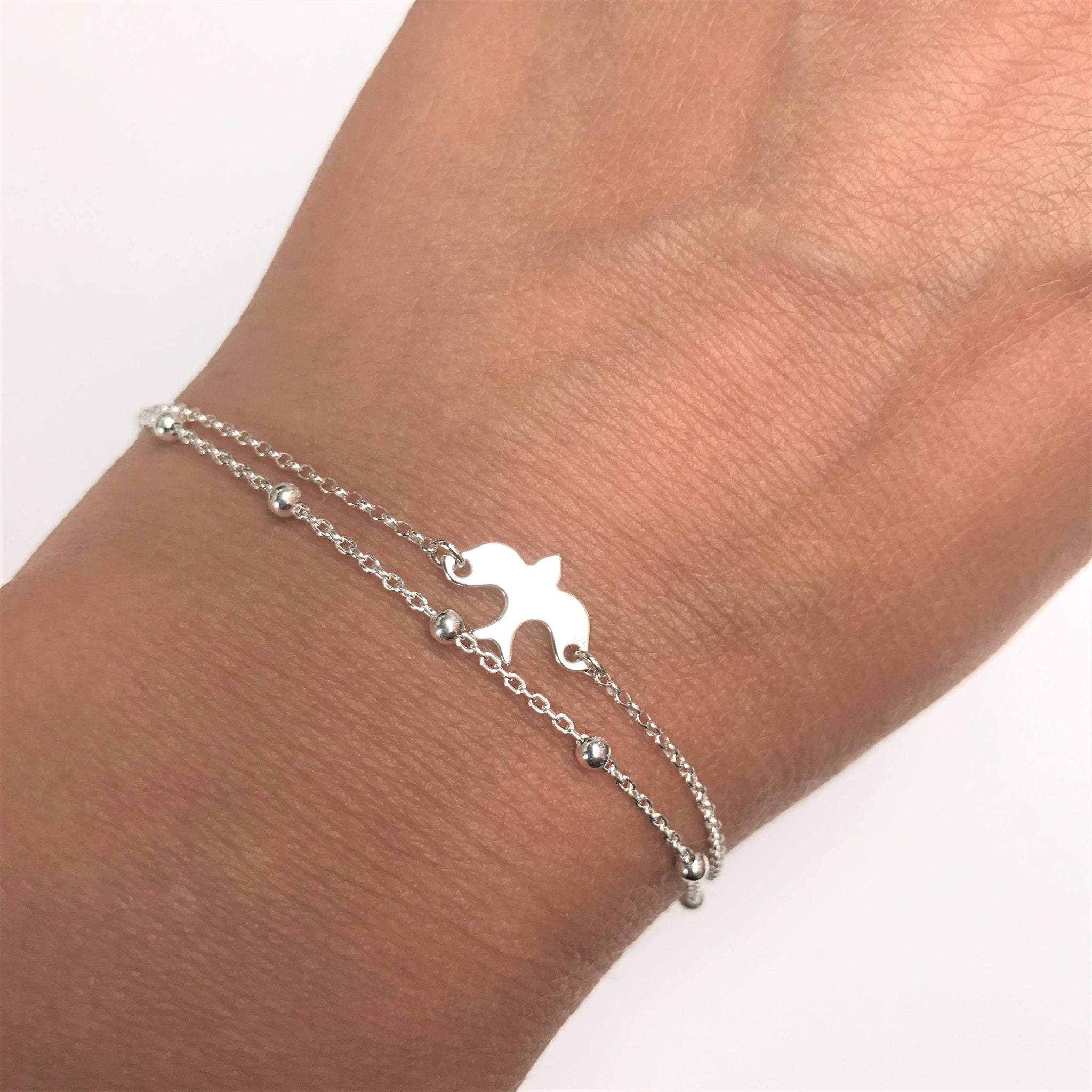 Soar Bird Bracelet, Layering Dove Sterling Silver Bracelet, Adjustable Double Chain Bird Bracelet