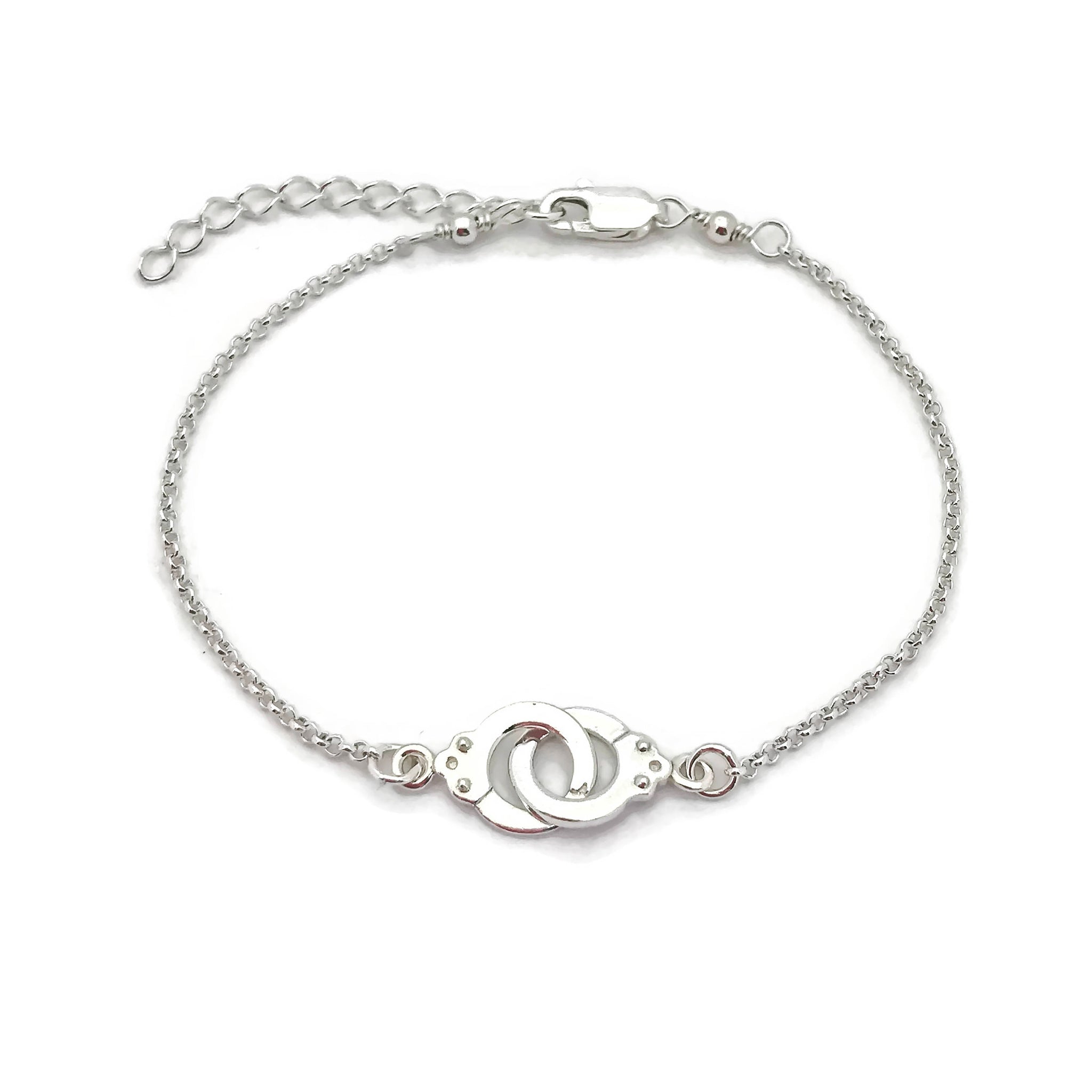 Sterling silver adjustable handcuff bracelet. A perfect gift for your best friend, sister, or your 'Partner in Crime.' Made of .925 sterling silver. The handcuff link measures 9x23mm. The bracelet is adjustable in length from 6.5" to 8".