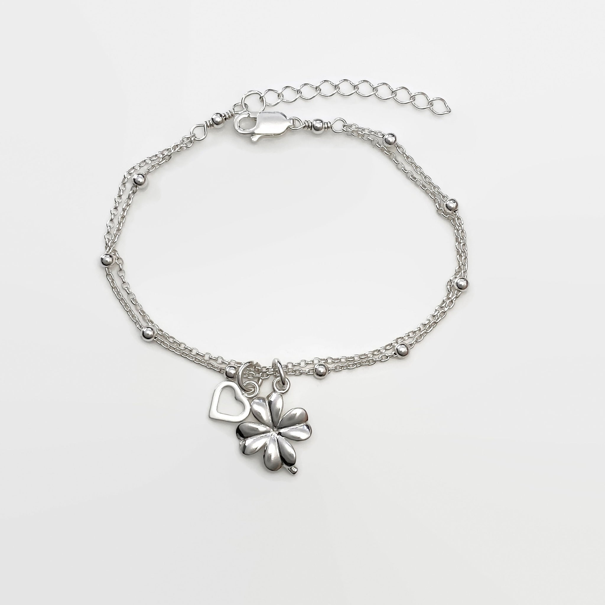 The bracelet features a sterling silver 3D four-leaf clover and a tiny heart charm.